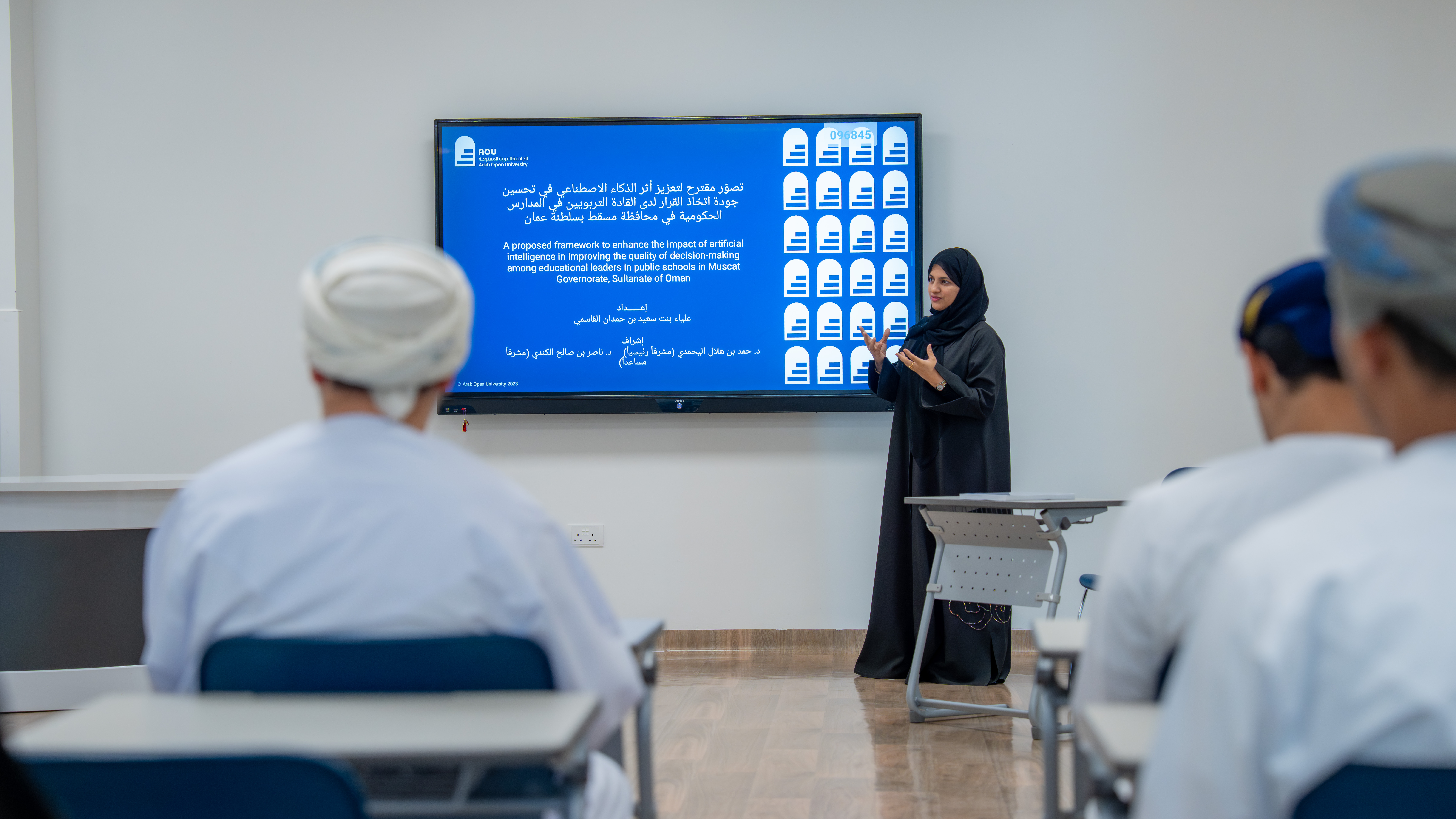 تم مناقشة رسالة الماجستير بعنوان: تصور مقترح لتعزيز أثر الذكاء الاصطناعي في تحسين جودة اتخاذ القرار لدى القادة التربويين في المدارس الحكومية في محافظة مسقط بسلطنة عمان. مقدمة من الطالبة: علياء بنت سعيد بن حمدان القاسمية.